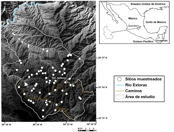 La región minera de San Joaquín se ubica al sur de la Sierra Gorda de Querétaro, México, comprendiendo 172 km2 entre las coordenadas 99º40’ y 99º30’ longitud W y 21º10’ y 20º50’ de latitud N. Las características fisiográficas y morfológicas de la región presentan un fuerte contraste entre elevadas cumbres, cuyas cúspides rebasan los 3000 m, y profundas depresiones a 900 m, donde corren las principales corrientes de agua (Martínez-Reyes et al., 2009). Existen climas desde el templado subhúmedo, semiseco y semicálido subhúmedo. La temperatura media anual es de 14°C y la precipitación media anual de 800 mm. La variación de altitudes origina una amplia variación de ambientes. Las unidades de suelo predominantes son Luvisol crómico, Cambisol crómico, Regosol calcárico y Leptosol (INEGI, 1989). La vegetación presente es bosque mesófilo de montaña, bosque caducifolio y bosque de pino-encino, así como matorral submontano y xerófilo (Rzedowski, 1978).