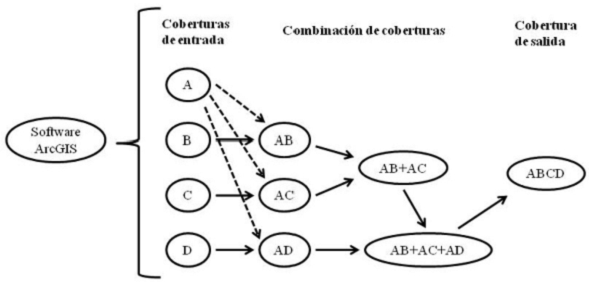 La asociación de mapas tiene la finalidad de integrar al mercurio total con las propiedades del suelo resultantes del análisis CART, permitiendo así analizar la distribución espacial del mercurio total a diferentes concentraciones y establecer sus relaciones con las propiedades del suelo. Este procedimiento consistió en dos partes: la primera fue que cada cobertura de las propiedades de interés se clasificara en rangos; en el caso del mercurio se consideró la NOM-147 (SEMARNAT, 2004), mientras que para las propiedades del suelo fue la NOM-021 (SEMARNAT, 2000), como apoyo también se usó la mediana de los datos. La reclasificación de los rangos de las coberturas obtenidas en el análisis geoestadístico se realizó con el módulo “reclass” de la herramienta “spatial analyst tool” del software ArcGIS 10.1 (Environmental Systems Research Institute Inc., 2006). La segunda parte contempló la combinación de las coberturas, en primera instancia de dos coberturas entre sus entidades poligonales con sus respectivas propiedades y rangos; las áreas donde las entidades se superponen se separaron en nuevas entidades con la información de ambas propiedades. El proceso anterior se desarrolló sucesivamente con las demás coberturas de cada propiedad (Figura 2). Se aplicó el módulo matemático “combinatorial” de la herramienta “spatial analyst tool” del software ArcGIS 10.1 para el agrupamiento de las propiedades y la obtención del mapa final.