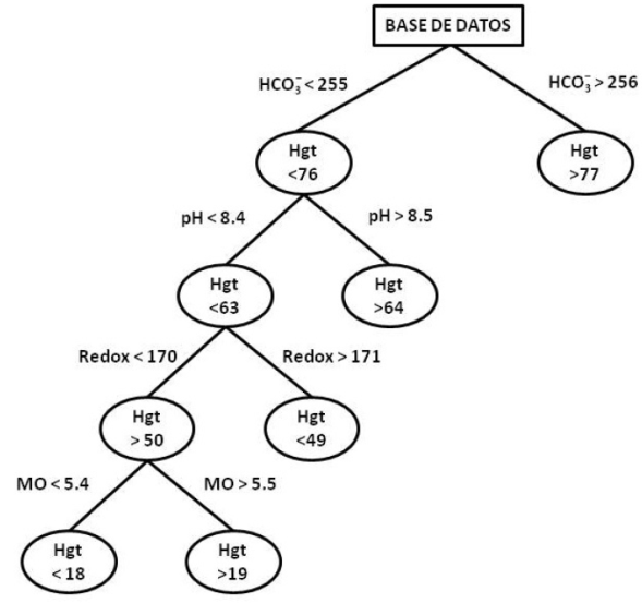 Como se observa en la Figura 3, la regresión con árboles de decisión permitió identificar relaciones del mercurio total con algunas propiedades químicas del suelo. La primera división de los datos se originó con la partición del árbol (nodo raíz) en el nivel de los bicarbonatos, ya que presentó la máxima pureza en los nodos. Los contenidos más altos de mercurio (> 77 mg/kg) se relacionan con las concentraciones de bicarbonatos superiores a 256 mg/kg, mientras que los contenidos de mercurio < 76 mg/kg, fueron relacionados con las menores concentraciones de bicarbonatos (< 255 mg/kg). Dentro de esta rama, los niveles de pH > 8.5 se relacionan especialmente con contenidos de mercurio superiores a 64 mg/kg, mientras que los pH < 8.4 concuerdan principalmente con contenidos de mercurio menores a 63 mg/kg. La siguiente rama fue el potencial redox, la mayor capacidad oxidativa (> 171 mV) se relaciona para contenidos de mercurio menores a 49 mg/kg, teniendo menor capacidad oxidativa (< 170 mV) los contenidos de mercurio mayores a 50 mg/kg. Finalmente, la última rama fue establecida por la materia orgánica, mostrando que, niveles mayores de 5.5 % de materia orgánica se relacionan con los contenidos de mercurio mayores a 19 mg/ kg; mientras que, niveles menores de 5.4 % de materia orgánica se relacionan con los contenidos de mercurio menores a 18 mg/kg.Con base en lo mencionado, se obtuvieron cuatro relaciones de mercurio total (Hgt) con diferentes propiedades del suelo: los bicarbonatos (HCO3-), el pH, el potencial redox (Eh) y la materia orgánica (MO). La tendencia general del resultado de la regresión con árboles de decisión fue la siguiente: 1) > [Hgt] : > contenido de HCO3-; 2) > [Hgt] : > nivel de pH; 3) > [Hgt] : < nivel de Eh; 4) > [Hgt] : > contenido de MO. Algunos estudios muestran relaciones positivas significativas del mercurio con el contenido de materia orgánica (Ravichandran, 2004). Sin embargo, para esta misma propiedad y otras como el pH y carbonatos, el patrón de correspondencia es muy variable, inclusive se ha obtenido una relación muy baja con la materia orgánica (Wang et al., 2009), relaciones negativas significativas con pH y carbonatos (Martin et al., 2006) ó ninguna relación significativa para pH y carbonatos (Gil et al., 2010).