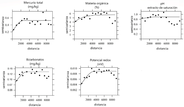 Los parámetros geoestadísticos de las propiedades químicas de materia orgánica, pH, potencial redox, bicarbonatos y de mercurio total se muestran en la Tabla 2 y Figura 4. El mercurio total y las propiedades del suelo presentaron efecto pepita (nugget), es decir, las semivarianzas no iniciaron cercanas al origen. Esto puede deberse a la escala de trabajo (Gallardo, 2006). La continuidad espacial quedó reflejada en la tasa de crecimiento de la semivarianza de acuerdo a los aumentos de la distancia de muestreo (rango); el potencial redox, los bicarbonatos y el pH presentaron mayor continuidad espacial, en comparación con el mercurio total y la materia orgánica. Esta menor continuidad en el caso del mercurio total puede atribuirse a la incorporación continua del contaminante por los terreros de mina; y en el caso de la materia orgánica a las deposiciones de residuos orgánicos provenientes de los bosques. Wang et al. (2016) mencionan que los factores intrínsecos del sitio (topografía y material parental) y los antropogénicos (actividad minera y fundición) afectan la variabilidad espacial. Un parámetro importante en la evaluación de la estructura espacial mediante el semivariograma es el rango (Mulla y McBratney, 1999). Para este caso en particular, se obtuvo el promedio de los rangos de la Tabla 2 y se ingresó en la ecuación del tamaño de muestra (TM = área / (rango/2)2), dando como resultado un TM de 96, lo cual es congruente con lo seleccionado en el estudio. La dependencia espacial de los datos se evaluó mediante la relación nugget y sill (Cambardella et al., 1994). Todas las propiedades químicas tuvieron dependencia espacial moderada excepto el pH el cual es débil. La dependencia espacial del mercurio y materia orgánica concuerda con lo encontrado por Lado et al. (2008) y Cruz-Cárdenas et al. (2014), respectivamente. El comportamiento de los semivariogramas en relación al origen fue lineal, para lo cual Emery (2013) sugiere emplear modelos de tipo esférico y exponencial, lo cual concuerda con los empleados en este trabajo, a excepción del pH que se ajustó mejor al modelo lineal.