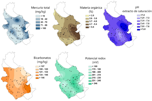 La Figura 6 muestra la asociación espacial del mercurio total con las propiedades químicas del suelo. Los contenidos de mercurio total > 100 mg/kg se relacionaron principalmente con: contenidos > 3.5% de materia orgánica, pH medianamente alcalino > 7.4, contenidos de bicarbonatos > 120 mg/kg y potenciales redox < 199 mV. Mientras que el mercurio total entre 24 y 99 mg/kg se asoció preferentemente con: los contenidos > 3.5% de materia orgánica y pH medianamente alcalino > 7.4, con potenciales redox tanto para mayores y menores de 200 mV y contenidos de bicarbonatos > 120 mg/kg.