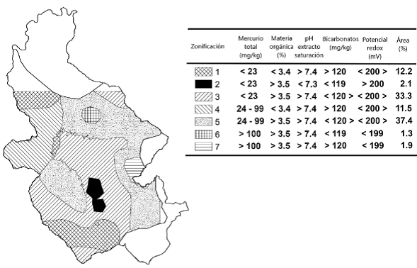Las regiones con mercurio total superior a 23 mg/kg representan el 46% de la zona de estudio. Esto significa que de acuerdo a la NOM-147 (SEMARNAT, 2004) esta área requeriría alguna obra de remediación. Sin embargo, la predominancia de rocas carbonatadas en la región hace que los pH en suelos sean medianamente alcalinos en un 98% del sitio (7.4 a 8.5) y favorece la presencia de bicarbonatos en un 68% del área con cantidades superiores a 120 mg/kg, repercutiendo en la estabilización del mercurio total (Higueras et al., 2003). Martin et al. (2006) señalan que las mayores variaciones en las propiedades están determinadas por las unidades de litología y atribuidos a la composición del material parental.