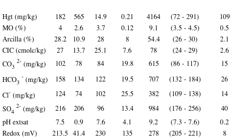 Las muestras de suelo se procesaron para determinar las siguientes propiedades: textura por el método de Bouyoucos; pH, en agua con una relación suelo-agua 1:2 y en el extracto de saturación, con un potenciómetro BECKMAN; conductividad eléctrica con un conductímetro CORNING; materia orgánica por el método de Walkley y Black (Etchevers-Barra, 1988); potencial redox con un equipo ORP Meter RE300; y capacidad de intercambio catiónico con el método de versenato. Se prepararon pastas de saturación para la obtención de extractos y evaluar carbonatos, bicarbonatos y cloruros con titulación volumétrica, y los sulfatos mediante colorimetría. Cada siete muestras se colocaron blancos con agua destilada para comprobar que los materiales utilizados no presentaban interferencias en los análisis, para detectar algún error en el análisis y para corroborar el buen funcionamiento de los equipos. Los procedimientos de laboratorio se realizaron considerando la Norma Oficial Mexicana 021 (2000).
