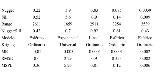 La tercera etapa fue la predicción espacial con kriging, este interpolador genera los resultados más próximos a las observaciones reales (Webster y Oliver, 2007). Los errores estándar se emplearon para seleccionar el mejor kriging (ordinario, simple ó universal) con base en la precisión de la interpolación. El análisis geoestadístico se realizó con los paquetes “gstat” y “geoR” del software R versión 2.15.2 (Pebesma y Graeler, 2016; R Core Team, 2016; Ribeiro y Diggle, 2016).