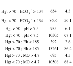 Los valores del análisis CART difieren a los mencionados en los mapas geoestadísticos debido a que, en el primero, el análisis se hizo con la base de datos completa, mientras que en el segundo, hay procesamiento de los datos, como la exclusión de datos atípicos y el ajuste a un modelo esférico, lineal y exponencial. A pesar de esta diferencia, la Tabla 3 muestra las relaciones espaciales entre el comportamiento de las propiedades del análisis CART y los parámetros de los mapas geoestadísticos. Los valores indican que las mayores concentraciones de mercurito total se ubican en áreas con mayor contenido de bicarbonatos, pH, materia orgánica y menor contenido de potencial redox, mientras que las áreas con menores concentraciones de mercurio total sucede lo contrario.