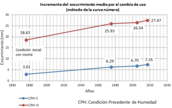 Para el año 2017, y con la misma intensidad de lluvia (75 mm/h), la escorrentía para CPH II fue de 7.35 mm y de 27.47 para CPH III. La diferencia entre estos valores extremos señala que la escorrentía se ha incrementado en 4.34 mm para CPH II y en 8.84 mm para CPH III durante el período 1876-2017, como consecuencia de la eliminación de 7092.28 ha de bosques nativos, de las cuales 6317.67 ha se desmontado durante el período 1876 - 1975 y las 774.61 ha durante el período de análisis, entre 1975- 2017 (Tabla 1).