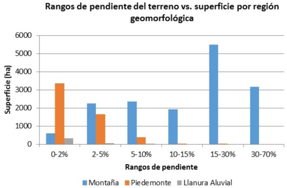 Este fuerte contraste de relieve entre las tres regiones, tal como se observa en el mapa de pendientes de la Figura 2, incrementa los riesgos de erosión hídrica y movimientos en masa en la zona montaña y pedemontana, y de los flujos torrenciales, inundaciones y sedimentación en las zonas planas, reuniendo así las condiciones de una típica toposecuencia erosiva (Sayago, 1992). El escurrimiento superficial es rápido en las laderas y piedemonte y lento a impedido con encharcamientos en la llanura aluvial y deprimida. Los suelos de la zona montañosa se desarrollan bajo un clima húmedo, con elevado aporte de materia orgánica, pero con fuertes pendientes y sustrato rocoso casi en superficie. Los sectores donde el material sedimentario que cubre el sustrato rocoso es de mayor espesor y/o las pendientes menos pronunciadas muestran perfiles más desarrollados. Los suelos dominantes pertenecen al orden Inceptisol, suelos poco evolucionados, algo más que los Entisoles, y se caracterizan por presentar, por lo general, un epipedón úmbrico oscuro, rico en materia orgánica (Puchulu y Fernández, 2014).