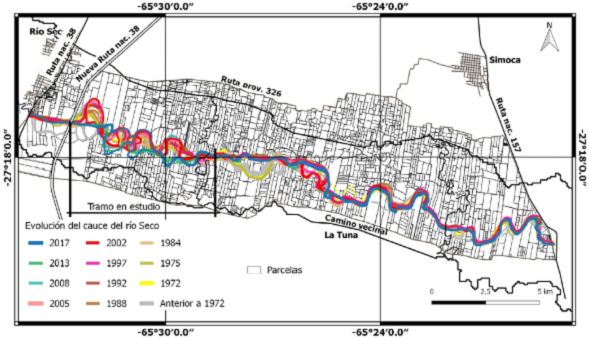 La Figura 14 muestra la evolución del cauce principal del río Seco durante el lapso temporal 1972-2017, desde la Ruta Nacional 38 hasta la Ruta Nacional 157. Puede observarse que el mayor proceso de meandrización se ha manifestado entre la nueva traza de Ruta Nacional 38 y la localidad de La Tuna.