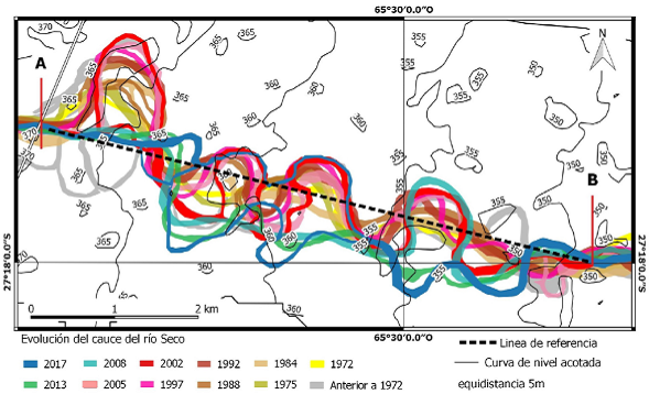 Las Figuras 15, 16 y la Tabla 5 dan cuenta de cómo ha variado el cauce del río Seco desde 1972 hasta 2017. De 1972 a 2002 tuvo un notable crecimiento de la sinuosidad. A partir de 2002 hasta 2011 se sucedieron procesos de cortes de meandros que disminuyeron la sinuosidad y desde el año 2011 al 2017 comenzó a incrementarse nuevamente la sinuosidad conjuntamente con la migración del cauce hacia el sur.
