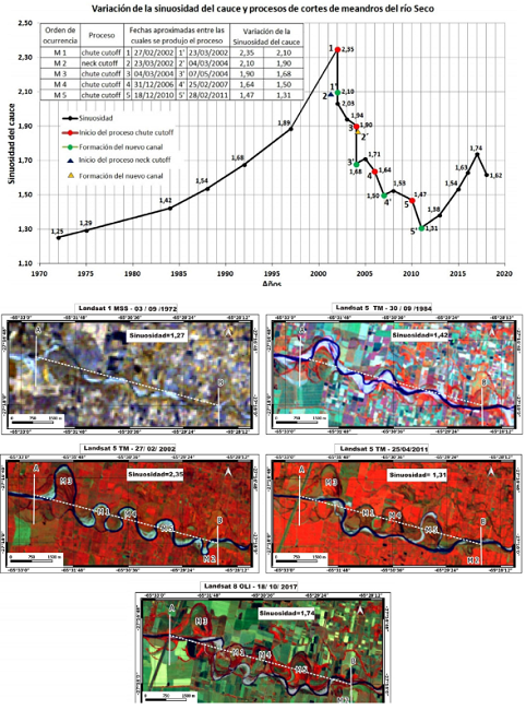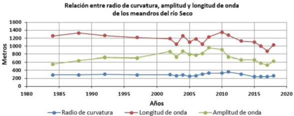El tramo analizado del río Seco ha tenido importantes variaciones en la morfología del cauce, durante el lapso temporal 1972-2017, con notables cambios en la sinuosidad del cauce, producidos por procesos activos de dinámica fluvial.