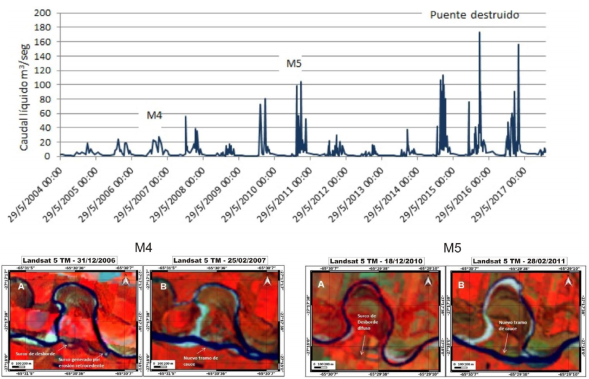Se comparó el hidrograma de descarga de caudal líquido, que abarca el lapso temporal mayo de 2004 a mayo de 2017 (Figura 17) registrado en la Estación Ruta Nacional 157 (Secretaría de Infraestructura y Política Hídrica de la Nación, 2018), referencia ERN 157 en Figura 6, con las imágenes satelitales Landsat multiespectrales, (combinación Land/Water: RGB: 4,5,3) utilizadas para resaltar el flujo de la corriente. Este procedimiento permitió relacionar los procesos de chute cutoff observados en el cauce con los picos de crecida de la corriente. Las modificaciones en el cauce estarían relacionadas con inundaciones relativamente altas. La conformación del canal que generó el corte del meandro M4 se produjo, aproximadamente, entre el 31/12/2006 y el 25/02/2007, aparentemente por una serie de inundaciones previas ocurridas en varias temporadas de lluvias, las cuales originaron caudales de 18 a 30 m3/seg. Por el contrario, el corte del meandro M5 ocurrió entre 18/12/2010 y 28/02/2011 y podría estar relacionado con eventos de inundación ocurridos en una temporada de lluvias, con caudales registrados de 72 a 104 m3/seg.