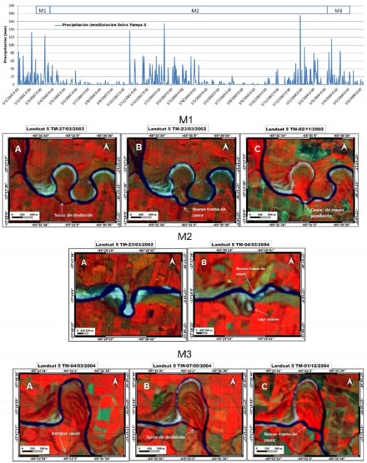 La Figura 18 muestra un pluviograma de precipitaciones diarias de la Estación Solco Yampa Ii (Secretaría de Infraestructura y Política Hídrica de la Nación, 2018) e imágenes satelitales comparativas de los cortes M1, M2 y M3. El único caso por tangencia (neck cutoff) fue el del meandro M2.