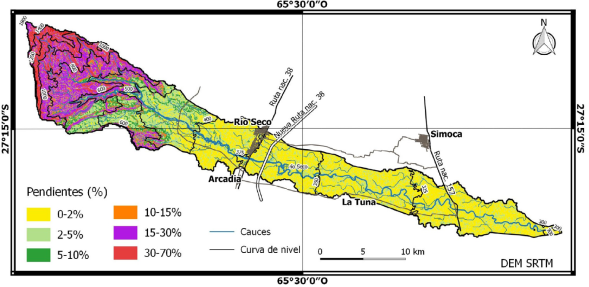 Aunque, el Índice de circularidad (Ic) arroja un valor de 0.27, lo que la clasifica como ovalada. En ese caso tendría moderado potencial de crecientes y alta producción sostenida de caudales. El coeficiente de torrencialidad Ct (5.53) revela una subcuenca de moderada torrencialidad. En el cálculo de este coeficiente interviene el número de cauces de primer orden, cuyo porcentaje es del 81% del total de cauces, por lo que indica la presencia de un sustrato poco permeable o impermeable próximo a la superficie en la zona montañosa. Hacia el piedemonte se incrementaría la permeabilidad por la presencia de suelos de mayor espesor. No obstante, los cultivos han alterado las propiedades físicas de estos suelos incentivando el predominio del escurrimiento sobre la infiltración. Las Figuras 12 y 13 muestran las pendientes de la subcuenca.