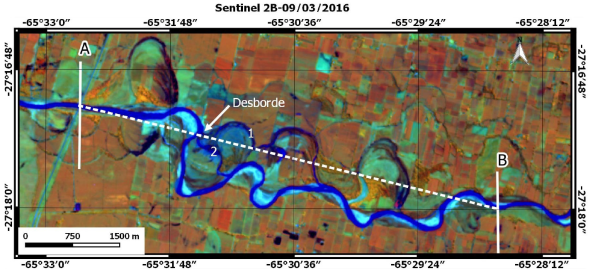 Durante las crecientes, el poder erosivo de la corriente amplía las curvas de los meandros, produciendo la migración de los mismos. Este proceso incluye incisiones en las márgenes cóncavas de los meandros, que, impulsadas por el flujo en exceso, produce desbordes, favorecidos por las depresiones del terreno, antiguos cauces de la llanura aluvial o meandros abandonados, en los cuales se encauza el flujo excedente. Las crecientes modifican este ambiente y cambian repentinamente el diseño del sistema fluvial durante las inundaciones. En la imagen Sentinel 2B del 9 de marzo de 2016 (Figura 20), se observa un evento de crecida que causó el desborde de la corriente principal en dos brazos: uno de ellos inundó los arcos de dos meandros abandonados de la margen izquierda hasta unirse con la corriente principal aguas abajo; el otro se encauzó en un tramo de canal de menor curvatura, acortando la trayectoria del meandro activo de la margen derecha, pero la corriente principal siguió la traza del bucle del meandro. En la temporada de aguas bajas, como se observa en la imagen Landsat 8 de la fecha 18/10/2017 (Figura 16), la corriente sigue encauzándose por los arcos de los meandros abandonados de la margen izquierda (posiblemente como consecuencia del desborde del cauce producido por la inundación del 9 de marzo de 2016) y por los meandros más recientes de la margen derecha, sin que se haya producido un corte efectivo del meandro como consecuencia de la ya mencionada inundación.