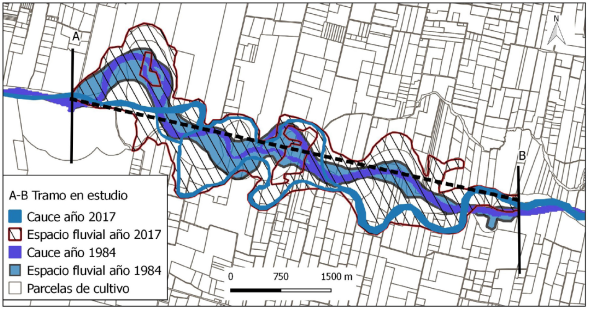 Los desplazamientos del cauce del río Seco han provocado importantes pérdidas de tierras que estaban dedicadas, desde antaño, al cultivo de la caña de azúcar por los procesos de desbordes y erosión lateral de cauces, los cuales cambian la orientación de la corriente, erosionando las barrancas compuestas de sedimentos no consolidados (arenas, limos y gravas), de elevada susceptibilidad a los procesos erosivos. Asimismo, produjeron la pérdida de 370.68 ha de suelos productivos, por lo que el volumen de suelo removido y transportado por las corrientes fue de 7413600 m3= 7.41 hm3, con una profundidad media de las barrancas de 2 m, afectando así, total o parcialmente, 94 parcelas de productores cañeros minifundistas. La Figura 21 esquematiza de manera detallada los espacios fluviales para los años 1984 y 2017. En las imágenes satelitales se observan sectores que fueron afectados por la corriente y luego abandonados. Los mismos fueron ocupados reiteradamente por los cultivos, con el riesgo de ser inundados nuevamente por las crecidas del río.
