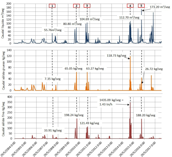 La Figura 22 muestra los hidrogramas de caudales líquidos y sólidos (gruesos y finos) desde mayo de 2004 a diciembre de 2017. Estas mediciones fueron realizadas en la Estación Ruta Nacional 157, ERN 157 en la Figura 6 (Secretaría de Infraestructura y Política Hídrica de la Nación, 2018). El registro de caudal líquido del 16 de febrero de 2015 (referencia 4 en la Figura 22) fue de 112.74 m3/seg. Este caudal transportó 118.73 kg/seg de caudal sólido grueso y 1435.09 kg/seg. de caudal sólido fino.