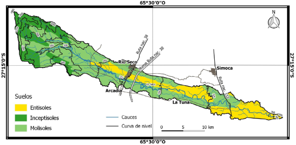 En la llanura aluvial se encuentran suelos de preponderante granulometría arenosa y limosa (Sayago, 1992). En la Figura 3 se muestra el mapa de suelos del Instituto Nacional de Tecnología Agropecuaria (2018), en donde puede observarse que en superficie se encuentran Inceptisoles (suelos jóvenes que carecen de horizontes diagnósticos), Entisoles (suelos jóvenes sin desarrollo del perfil ni horizonte diagnóstico, que se desarrollan sobre materiales aluviales estratificados y, ocasionalmente, se encuentran saturados por agua) y Molisoles (suelos minerales que tienen un horizonte superficial muy oscuro, coloreado y rico en bases, casi todos estos suelos tienen un epipedón mólico y muchos también poseen un horizonte de diagnóstico subsuperficial argílico, nátrico o cálcico).