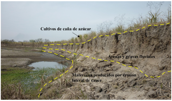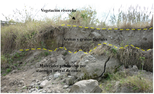Las corrientes debieron cortar los aluviones para labrar su nuevo cauce por rectificación o corte del meandro por desborde (chute cutoff). Este proceso, relacionado con fuertes crecientes y arrastre de material fino, arenas y gravas, fue acompañado por erosión retrocedente e incisión vertical del cauce. Posteriormente, la corriente tuvo mayor influencia sobre la margen derecha, con su máxima expresión en el año 2017.