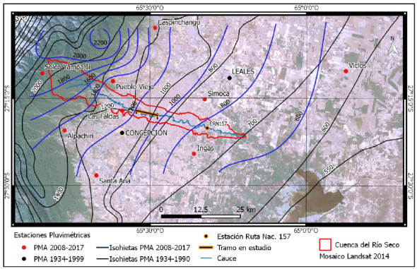 A partir del procesamiento de los datos pluviométricos obtenidos de la Estación Experimental Agroindustrial Obispo Colombres, Sección Agrometeorología (2018), y de la Secretaría de Infraestructura y Política Hídrica de la Nación (2018), se confeccionó un mapa de isohietas de precipitación media anual para la cuenca del río Seco, en el lapso temporal 2008-2017. De la última página mencionada, se descargaron, además, registros de caudales líquidos y sólidos obtenidos en la Estación de Aforos Ruta Nacional 157, con los cuales se confeccionaron hidrogramas de descarga de la cuenca para el lapso temporal 2004-2017. Se realizaron dos campañas para describir las características de los sedimentos de las barrancas afectadas por los procesos erosivos, relevar y definir rasgos erosivos en el piedemonte y la llanura, medir las pendientes del terreno y del cauce con clinómetro marca Suunto y corroborar la información obtenida por teledetección en gabinete.