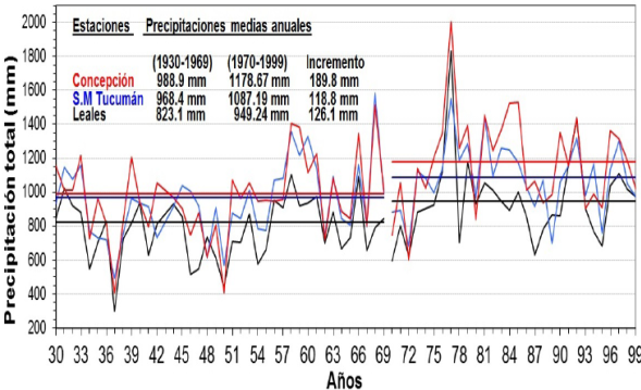 La Figura 8, tomada de Toledo et al. (2001), muestra las curvas de precipitaciones medias anuales de las estaciones pluviométricas El Colmenar, Leales y Concepción. De igual manera, se observa el marcado cambio en el régimen pluviométrico, con incremento del 30% de las precipitaciones a partir del año1970. Un nuevo análisis de consistencia de los datos utilizados para la construcción de la Figura 8 indicaría un incremento mayor en la media de las precipitaciones, en el orden del 35 al 40%.