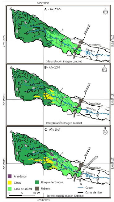 La subcuenca de aporte al sistema de meandros comprende la cuenca alta y parte de la media del río Seco. Abarca una superficie de 21631.34 ha y su máxima altura es de 1818 msnm (a media ladera del Aconquija), mientras que su mínima se encuentra a los 369 msnm. En esta área el uso de la tierra se ha modificado lentamente desde 1975 hasta 2017. La Figura 9 muestra los cambios en la cobertura de la subcuenca y la Tabla 1 resume dichos cambios.