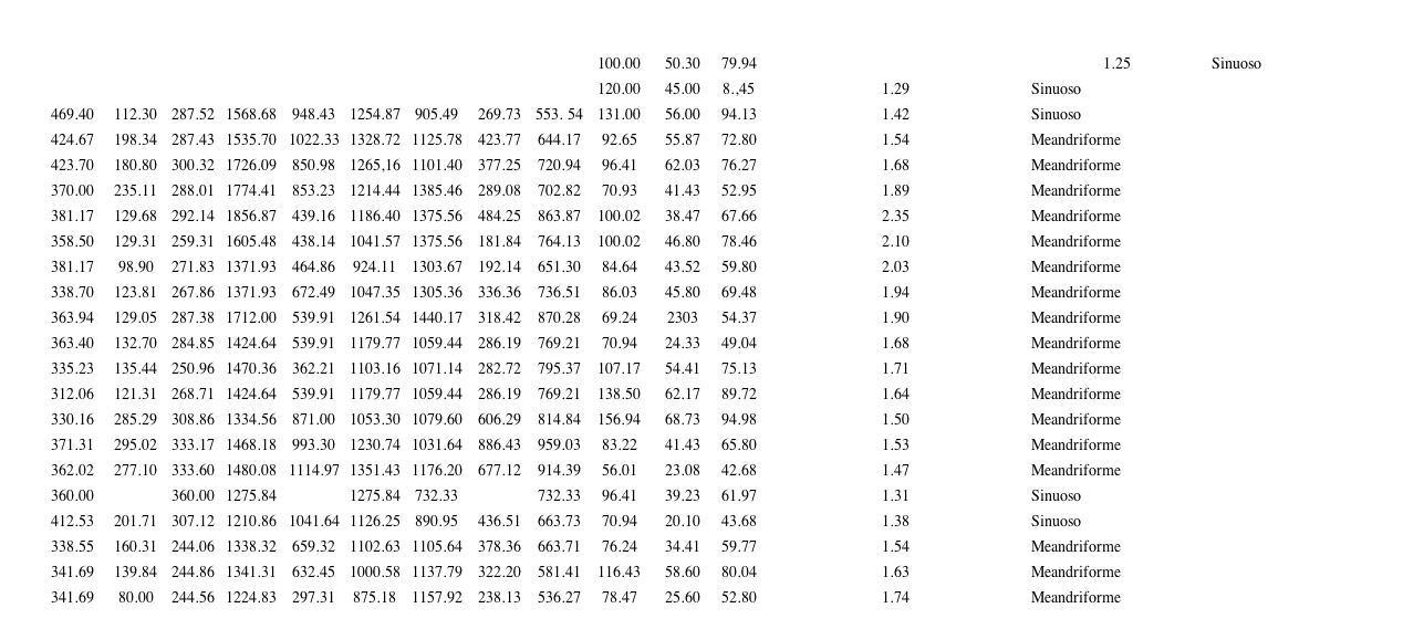 Según Leopold y Wolman (1957), los trazados de los cauces fluviales se clasifican, normalmente, en tres tipos: 1) rectos, 2) meandriformes y 3) trenzados. Miall (1977) reconoció la existencia de otros diseños de cauce como es el tipo sinuoso, cuyo trazado es la transición entre el recto y el meandriforme o el anastomosado. Considera un cauce rectilíneo a aquel que tiene una sinuosidad inferior a 1.05, sinuoso cuando está comprendido entre 1.05 y 1.5 y meandriforme si su sinuosidad es mayor a 1.5 y tiene curvas alternantes que configuran un cauce con diseño serpenteante.