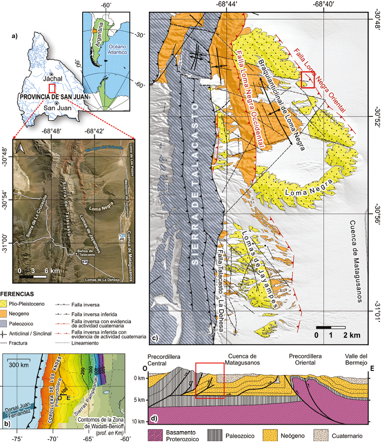 Entre los 29 ° y 33 ° S, la placa de Nazca se introduce por debajo de la Sudamericana a una velocidad de 6,3 cm/año (e.g., Ramos, 1988; Kendrick et al., 2003) con azimut de ~78 ° (Vigny et al., 2009) y un ángulo subhorizontal (entre 5° y 10°). Esta geometría de placa plana es atribuida a la subducción de la dorsal Juan Fernández (Figura 1b) (e.g.,Pilger, 1981; Anderson et al., 2007) y se caracteriza por la presencia de importantes estructuras tectónicas activas y por el desarrollo de un frente orogénico que pliega incluso los depósitos aluviales cuaternarios (Bastías, 1985; Costa et al., 2000; Perucca et al., 2013; Perucca y Vargas, 2014; Audemard et al.,, 2016; Costa et al., 2020). Además se destacan los cabalgamientos de las secuencias neógenas sobre esos depósitos de piedemonte (Ramos, 1997). Ortiz y Zambrano (1981) dividieron la Precordillera en tres dominios de acuerdo a su estilo estructural, a los que denominaron Precordillera Occidental, Central y Oriental. La Precordillera Central, donde se desarrolla la presente investigación, está constituida por cordones montañosos de orientación meridional, que se extienden a lo largo de toda la provincia de San Juan. Posee un estilo de deformación de una faja plegada y corrida de piel delgada (thin skinned fold and thrust belt) con una marcada vergencia hacia el este (Jordan et al., 1984, 1993; Ramos, 1988, 1999; Ramos et al., 1997; Costa et al., 2000; Kay y Mpodozis, 2002). Estos cabalgamientos forman un abanico imbricado hacia el antepaís (Boyer y Elliot, 1982), donde las láminas imbricadas antiguas se disponen sobre las más nuevas, generando el aumento progresivo de las inclinaciones originales e incluso el vuelco de los planos de cabalgamiento (von Gosen, 1992). Está constituida por al menos cuatro y hasta seis cabalgamientos principales con su nivel de despegue en la secuencia cambro-ordovícica (Allmendinger et al., 1990), fallas fuera de secuencia y estructuras de interferencia resultantes de la interacción con la estructuración de la Precordillera Oriental, caracterizada por fallas de alto ángulo de vergencia occidental (Zapata y Allmendinger, 1996) (Figura 1d). La estratigrafía en el piedemonte de la sierra de Talacasto está caracterizada por rocas de edad ordovícica (calizas y dolomías) y neógena (conglomerados, sabulitas, areniscas, limolitas y limoarcilitas). El Cuaternario está representado principalmente por aglomerados, fanglomerados y depósitos aluviales y coluviales provenientes de los sectores serranos (Furque et al., 1998; Milana, 2003) (Figura 1c).