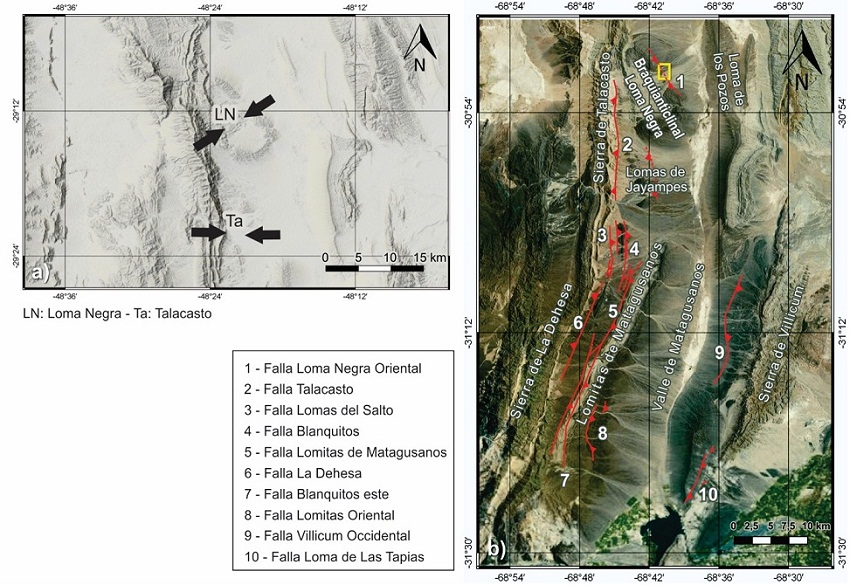 La elevada sismicidad de intraplaca y la notable actividad neotectónica a esta latitud también es consecuencia de la subducción subhorizontal de la placa de Nazca por debajo de la Sudamericana, que traslada la deformación hacia el antepaís (Ramos et al., 1986). Siame et al. (2005) señalaron que, debido a la convergencia oblicua entre estas placas, la región además de estar sometida a tectónica contractiva, habría estado dividida a nivel cortical entre movimientos de deslizamiento de rumbo e inversos durante el Plioceno-Cuaternario. En la zona de Matagusanos-Talacasto-Tucunuco, el eje de esfuerzos σ1 es subhorizontal y presenta una orientación N50°E (Figura 2a). Otras contribuciones han demostrado que la deformación transpresional tuvo lugar en Precordillera durante el Mioceno (Japas, 1998; Ré et al., 2001; Siame et al., 2005; Álvarez-Marrón et al., 2006; Alcacer y Perucca, 2017). Para el segmento de subducción horizontal pampeano, Japas et al. (2016) discriminaron fajas transpresivas sinestrales que estarían vinculadas a la convergencia oblicua de las placas ya la activación de estructuras sinestrales de orientación NO.