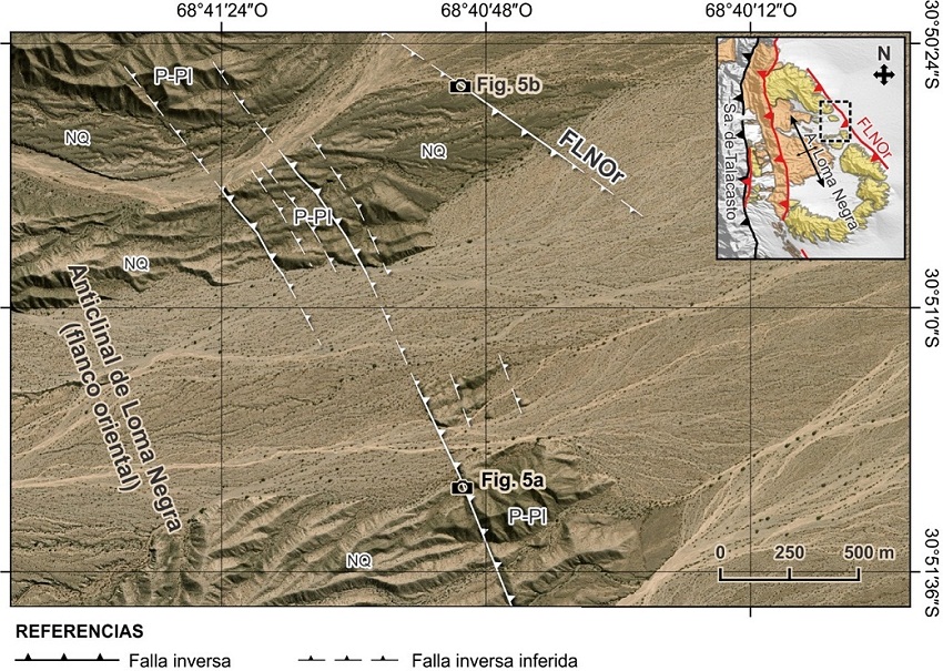 En el área de estudio, el piedemonte oriental de la sierra de Talacasto, Perucca et al. (2014) identificaron estructuras con actividad tectónica cuaternaria tales como la falla Talacasto-La Dehesa, inversa de alto ángulo (70° O) y rumbo N-S, que flanquea por el este a la sierra de Talacasto, elevando las calizas ordovícicas que componen dicha serranía sobre sedimentitas del Neógeno (Figuras 1c, 3a y 3b). También mediante evidencias geomorfológicas tales como abanicos sobreelevados y con pendientes anómalas, cauces colgados, etc., sugirieron la existencia de actividad tectónica cuaternaria en el sector. Además, definieron la Loma Negra como un braquianticlinal con eje NO (N140°E), de vergencia oriental, con el núcleo formado por bancos de areniscas y limolitas del Mioceno superior-Plioceno inferior y sus flancos compuestos por estratos conglomerádicos más competentes, correspondientes al Plioceno-Pleistoceno inferior (Figura 1c). El flanco occidental del braquianticlinal está truncado por una falla inversa de rumbo meridional, alto ángulo (70°) de inclinación h acia el SO y vergencia oriental a la que Perucca et al. (2014) denominaron falla Loma Negra Occidental (Figura 1c). En su tramo central, la falla dispone estos depósitos neógenos indiferenciados por encima de sedimentitas del Plioceno inferior (Figura 3c). En los extremos norte y sur del braquianticlinal, la falla coloca rocas asignadas por estos autores al Neógeno sobre conglomerados del Plio-Pleistoceno (Figura 3d). En el interior de esta estructura plegada, estos autores identificaron escarpas subparalelas, de rumbo submeridional, con la cara libre al oeste y a contrapendiente de la pendiente regional. Las fallas inversas de vergencia occidental y alto ángulo colocan los conglomerados del Plioceno-Pleistoceno sobre depósitos aluviales asignados al Pleistoceno tardío (Figuras 4 y 5a). La distribución espacial de la deformación cuaternaria en planos de fallas subparalelos, es típico de las estructuras flexodeslizantes (Yeats et al., 1997). Así, este tipo de fallas, de trazo rectilíneo y en apariencia controladas por la estratificación de los conglomerados del Plio-Pleistoceno han sido consideradas en otros sectores de la Precordillera Central (sistema de fallas Blanquitos) como estructuras controladas por mecanismos flexodeslizantes (Costa et al., 1999). Sin embargo, no descartaron que estas estructuras de vergencia occidental constituyan retrocabalgamientos con ángulos elevados cerca de la superficie y asociados al cabalgamiento Loma Negra Oriental, de vergencia oriental. En el flanco oriental del braquianticlinal de Loma Negra, Perucca et al. (2014) identificaron la FLNOr, de vergencia oriental y rumbo submeridional, que afecta a una terraza fluvial a la cual asignaron tentativamente una edad holocena, objeto de estudio en este trabajo (Figuras 4 y 5b).