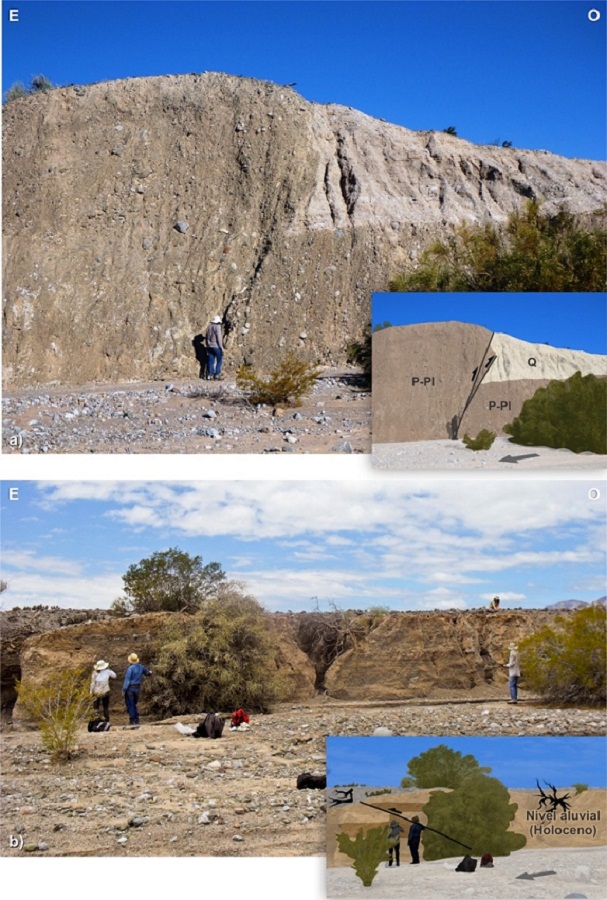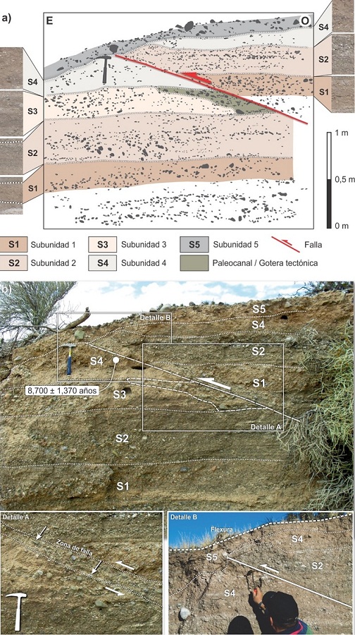El registro sedimentario expuesto en la pared sur de la terraza de acumulación (Figura 6b) está conformado de base a techo por 5 subunidades depositacionales tabulares prácticamente horizontales que fueron desplazadas por la actividad de la falla:
