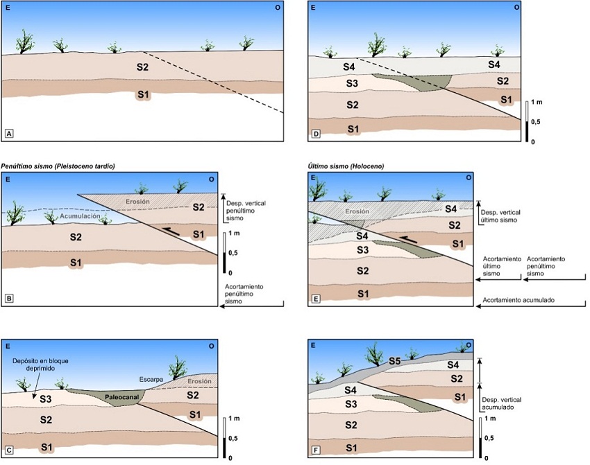 En esta exposición natural se efectuó además el análisis de retrodeformación de cada evento (Figura 7), a modo de identificar la cantidad de deformación producida por cada paleoterremoto. Esta restauración permitió estimar los valores de salto cosísmico para cada evento. En primera instancia, se depositaron las subunidades aluviales S1 y S2 (Figura 7a). Durante el primer evento ocurrido durante el Holoceno, la falla desplazó ambas unidades (S1 y S2) generando una escarpa con la cara libre al este (Figura 7b). Posteriormente se depositó en el bloque hundido el nivel S3, parcialmente derivado de la subunidad S2 ubicada en el bloque elevado (Figura 7c). Asociado a este desplazamiento y como evidencia de este movimiento, se relevó un paleocanal o gotera tectónica (Audemard, 1999) desarrollado paralelo al pie de la escarpa generada por el evento sísmico. Posteriormente se depositó la subunidad S4 que cubrió el terreno regularizando el escarpe, sugiriendo un periodo en el que la tasa de sedimentación fue mayor a la tectónica o un periodo intersísmico (Figura 7d). Un segundo evento posterior a los 8.700 ± 1.370 años desplazó la subunidad S4, cuya escarpa ha sido redondeada y posteriormente se depositó la subunidad S5 que corresponde a un suelo incipiente (Figura 7f). La suave flexura que presenta la superficie actual de la terraza y el pequeño desplazamiento que muestra el nivel S5 podría sugerir la ocurrencia de un tercer evento durante el Holoceno, aunque la falla no cortó la superficie (Figura 6b, detalle B).