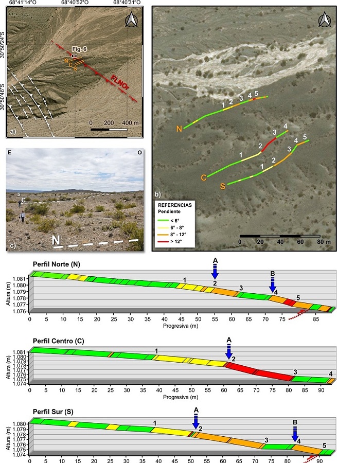 En el perfil Norte (Figura 8b y 8c) en un recorrido de 90 m con una diferencia de cota de ~5,3 m entre los puntos de mayor y menor altura del perfil, se identificaron dos escarpas (A y B). La escarpa B se relaciona espacialmente con la expresión superficial de la FLNOr, analizada en la exposición natural de la terraza. El perfil Centro (Figura 8b y 8c), tiene una extensión de 93 m con una diferencia de cota de 7 m entre sus puntos extremos. En él se aprecia solo una escarpa con claridad (A) y además un cambio de pendiente que puede considerarse como el inicio de la segunda escarpa (B) identificada en el perfil Norte. La traza del perfil Centro no se continuó más hacia el este porque el terreno es disectado por cauces fluviales que obliteran los resultados. El perfil Sur (Figura 8b y 8c) muestra las dos escarpas (A y B) en un tramo de 93 m y un desnivel de 6 m entre ambos extremos. A partir del análisis de los perfiles topográficos, se clasificaron estos cambios de pendiente de la superficie del nivel aluvial, como correspondientes a escarpas multi-eventos posiblemente originados, cada uno de ellos, por un evento de ruptura individual.