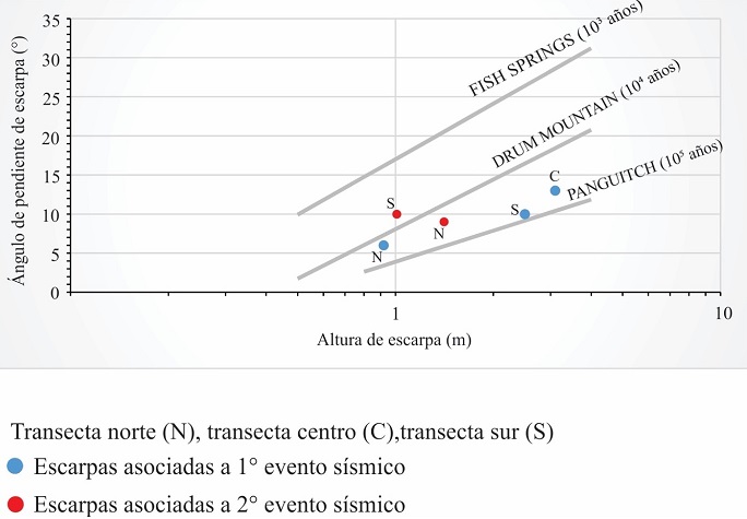 Se graficaron los valores de pendiente de las escarpas de cada transecta para ver el diseño de la traza de falla, teniendo en cuenta que una falla inversa de bajo ángulo puede romper de diferente manera a lo largo de su traza. Los valores para el primer y segundo evento considerados en cada transecta caen en una región del ábaco muy cercanos entre sí. Tomando las pendientes de cada escarpa, observadas en los tres perfiles y de acuerdo a la metodología desarrollada por Wallace (1977) y Bucknam y Anderson (1979) mencionada anteriormente, la escarpa A tendría una edad entre 10.000 y 100.000 años y la escarpa B, una edad entre 1.000 y 10.000 años (Figura 9). Esta última es consistente con la edad numérica obtenida para el último nivel aluvial afectado por la falla, de 8.700 ± 1.370 años AP