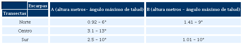 La escarpa A muestra las mayores alturas y ángulos de talud en las transectas Centro y Sur, hacia el sureste de la trinchera analizada (Tabla 1). La escarpa B tiene alturas cercanas al metro en los perfiles Norte y Sur; ésta no fue interceptada por el perfil Centro por su extensión limitada. No obstante, es posible apreciar que todas presentan un aspecto redondeado, suave y con la cara libre al este.