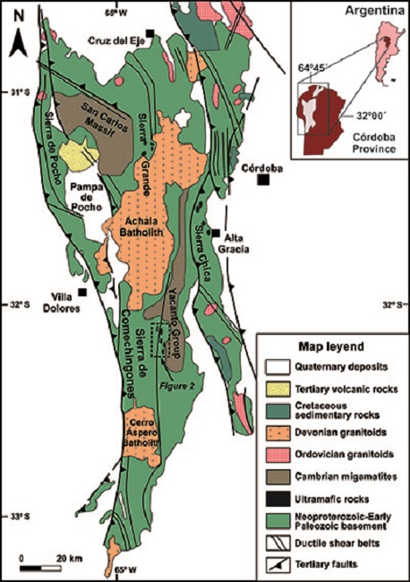 The Eastern Pampean Ranges constitute the easternmost exposure of the metamorphic basement of the Central Andes, in northern Argentina (Figure 1), and represent an accretionary orogen developed during the Neoproterozoic-Early Cambrian at the SW paleo-Pacific margin of Gondwana (e.g.,Escayolaet al., 2007;Colloet al., 2009). The Eastern Pampean Ranges are mainly composed of low- to high-grade metamorphic sedimentary and igneous units that are essentially constituted by garnet-biotite gneiss and biotite schists, with minor occurrence of marbles, phyllites, amphibolites and ultramafic rocks of ophiolitic affinity (e.g.,Escayolaet al., 1996,2004,2007;Rapelaet al., 1998,2016). These units were locally migmatized (i.e., San Carlos Massif and Yacanto Group;Martinoet al., 1995;Siegesmundet al., 2010;Guereschi and Martino, 2008) and intruded by Early Cambrian granitoids (Rapelaet al., 1998;Escayolaet al., 2007) (Figure 1). All the basement units were intruded by Ordovician and Devonian metaluminous to peraluminous granitoids (e.g.,Rapelaet al., 1998,2018;Pinottiet al., 2002;Geunaet al., 2008) and were locally covered by Cretaceous volcanic-sedimentary sequences and Cenozoic volcanic rocks (Ramoset al., 1991;Kay and Gordillo, 1994;Lagorioet al., 2016 and references therein) (Figure 1).