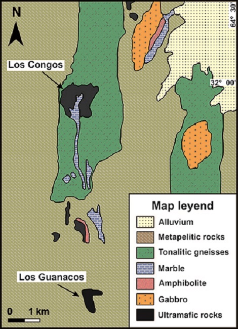 In this research work we provide a detailed study including petrographic observations, analysis of major, minor and trace element composition of chromites, coupled with thermodynamic modelling for chromitite bodies from Los Congos and Los Guanacos ultramafic massifs in the Eastern Pampean Ranges, northern Argentina (Escayolaet al., 2004;Proenzaet al., 2008). These ultramafic massifs are among the few known examples of suprasubduction zone ophiolites in Latin America that contain a mantle section with chromitites that have experienced high-temperature metamorphism as a result of a continent-continent collisional orogeny (e.g., Escayolaet al., 2007;Colloet al., 2009). Therefore, this regional context is important to evaluate the geochemical fingerprints of prograde metamorphism in chromites from ophiolitic chromitites.