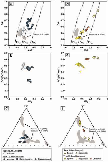 The chromitite bodies consist of massive (>80 vol.% chromite), semi-massive (50-80 vol.% chromite), and to a lesser extent, disseminated (30-50 vol.% chromite) textures. These chromitites were intensely modified by metamorphism, which has produced the three textural varieties of chromites defined byColáset al. (2016) (Table 1;Figure 3). Type I chromite, without exsolved phases and optically homogeneous (Figure 3a), shows a trend of increase of Cr# [Cr/(Cr+Al) atomic ratio] coeval with a decrease of Mg# [Mg/(Mg+Fe2+) atomic ratio] displaced at lower Mg# from massive (Mg# = 0.52-0.68 and Cr# = 0.47-0.72), semi-massive (Mg# = 0.48-0.55 and Cr# = 0.60-0.73) to disseminated (Mg# = 0.42-0.52 and Cr# = 0.55-0.63) chromitites (Table 1;Figure 4a to4c). The Fe3+/(Fe3++Fe2+) ratio varies from 0.43 to 0.54 in Type I chromite from massive and disseminated chromitites, but is lower in Type I chromite from semi-massive chromitites (Fe3+/(Fe3++Fe2+) = 0.24-0.27) (Table 1;Figure 4a to4c). Type II chromite shows a magnetite-rich phase (Mg# = 0.21-0.23, Cr# = 0.85-0.87, and Fe3+/(Fe3++Fe2+) = 0.62-0.63) that forms irregular blebs randomly distributed along the rims or linear strings, and fine lamellae with apparent crystallographic control hosted in a spinel-rich phase (Mg# = 0.56-0.63, Cr# = 0.50-0.54, and Fe3+/(Fe3++Fe2+) = 0.43-0.52) (Table 1;Figures 3c and4d to4f). Type III chromite, with symplectitic texture, is composed of variable proportions of magnetite-rich (Mg# = 0.29-0.33, Cr# = 0.76-0.79, and Fe3+/(Fe3++Fe2+) = 0.62-0.64) and spinel-rich (Mg# = 0.64-0.73, Cr# = 0.41-0.43, and Fe3+/(Fe3++Fe2+) = 0.40-0.54) phases (Table 1;Figures 3d and4d to4f). This chromite prior to exsolution have similar Mg# (0.44-0.50) and Cr# (0.54-0.59), but higher Fe3+/(Fe3++ Fe2+) (0.60-0.61) than Type I chromite from disseminated chromitites (Mg# = 0.42-0.52, Cr# = 0.55-0.63, and Fe3+/(Fe3++Fe2+) = 0.43-0.48) (Table 1;Figures 4a to4c).