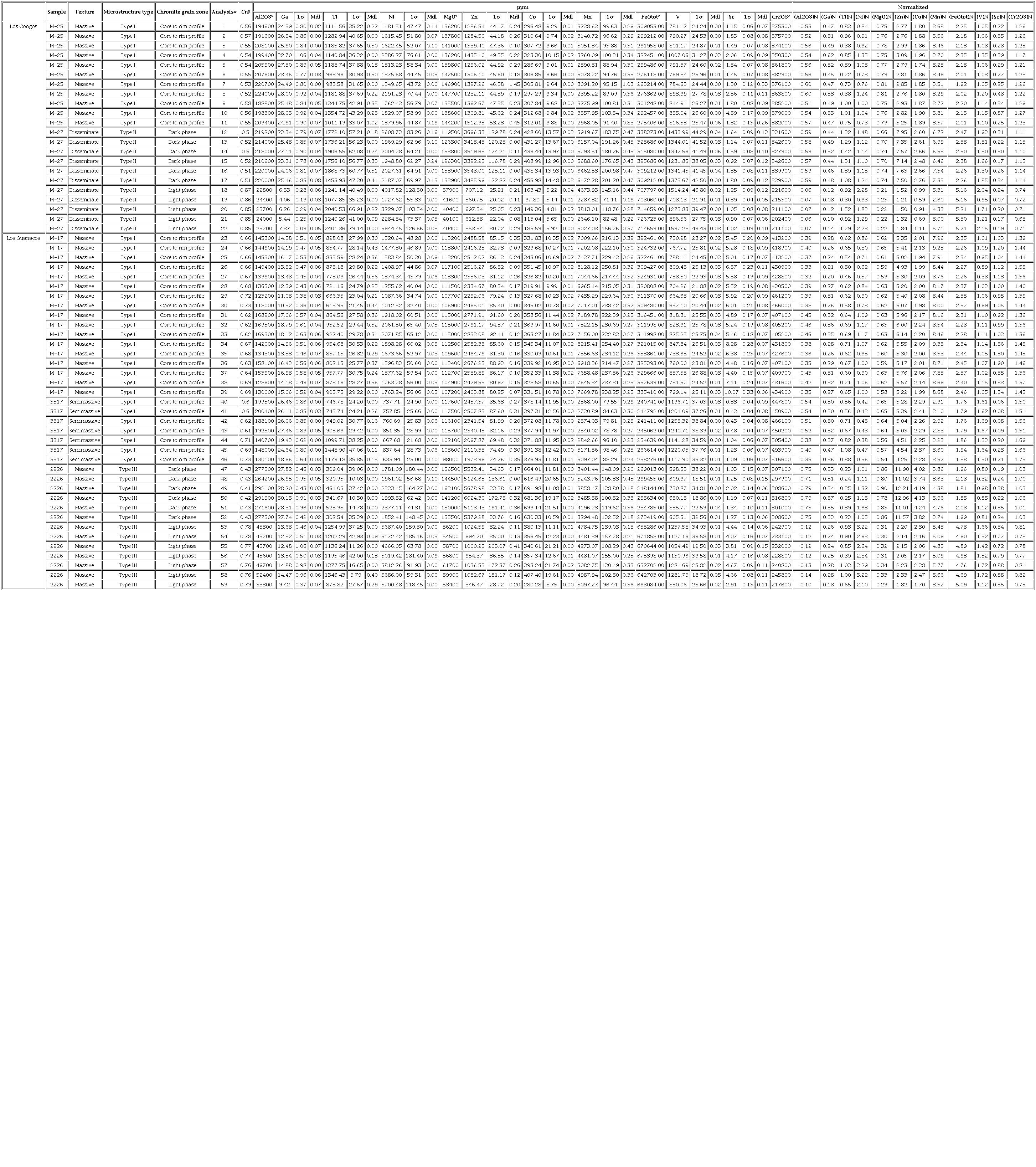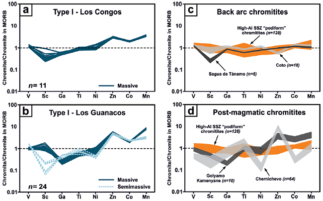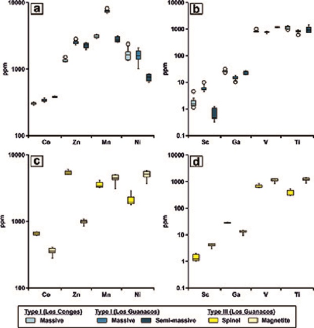 In situ LA-ICP-MS analyses of Type I chromite in massive chromitites from Los Congos and Los Guanacos show variable albeit similar contents of Ga (10.32-32.70 ppm), Ti (615-1354 ppm), Zn (1282-2853 ppm), and Mn (2890-8215 ppm), higher contents of Sc (1.5-10.07 ppm) and Ni (1012-2386 ppm), and lower contents of Co (287-370 ppm) and V (657-1007 ppm) than those in semi-massive chromitites from Los Guanacos (Ga = 18.96-27.46 ppm, Ti = 746-1449 ppm, Zn = 1974-2508 ppm, Mn = 2540-3172 ppm, Sc = 0.33-1.23 ppm, Ni = 634-851 ppm, Co = 372-397 ppm, V = 1118-1255 ppm) (Figure 5a to5b). Spinel-rich phase of Type III chromite in massive chromitites from Los Guanacos are enriched in Ga (26.95-30.13 ppm), Co (616-699 ppm) and Zn (5118-6024 ppm), but depleted in Sc (1.03-2.02 ppm), V (598-836 ppm), Ti (302-526 ppm), Mn (3244-4197 ppm) and Ni (1781-2877 ppm) than the magnetite-rich phase (Ga = 9.42-14.88 ppm, Co = 280-407 ppm, Zn = 846-1082 ppm, Sc = 2.19-4.67 ppm, V = 830-1282 ppm, Ti = 876-1378 ppm, Mn = 3097-5083 ppm, Ni = 3700-5812 ppm) (Figure 5c and5d).In situ analyses of Type II chromite from Los Congos were excluded because the beam size of LA-ICP-MS (~30-50 μm) is larger than the size of the exsolved phases (seeFigure 3c).