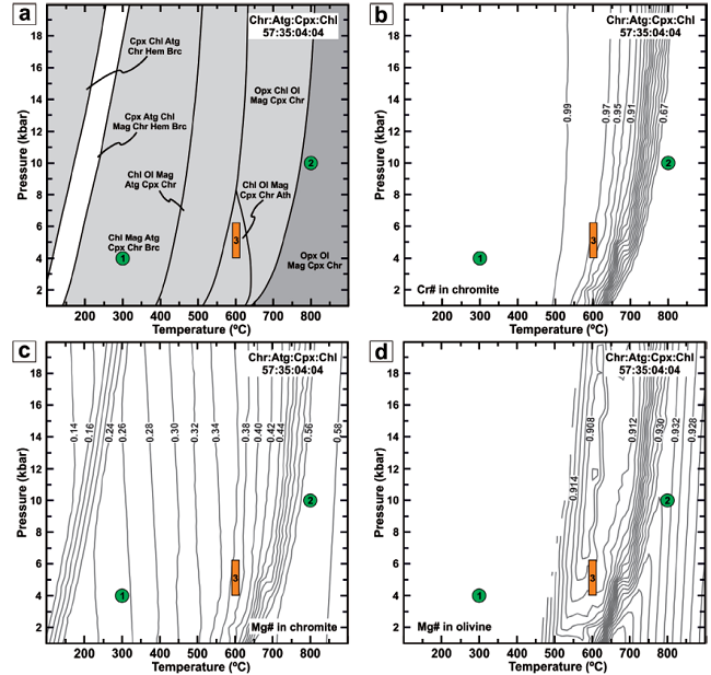 Such an approach allowed us to construct a pseudosection for Type I chromite, contoured for Cr# and Mg#, in the fluid-saturated FeO-Fe2O3-Cr2O3-MgO-Al2O3-CaO-SiO2-H2O (FCrMACaSH) system (Figure 7). In our computations, we have used an initial assemblage of chromitite bulk composition of semi-massive (57:35:04:04) molar mix of chromite, antigorite, clinopyroxene and chlorite (Table 1). The composition of chromite is the Type I chromite with the lowest Fe3+/(Fe2++Fe3+) ratio [(Mg0.48Fe0.52)(Cr0.72Al0.28Fe0.08)O4], and that of antigorite [(Mg0.48Fe0.52)(Cr0.73Al0.27Fe0.08)O4], clinopyroxene [(Ca0.5Mg1.44Fe0.06)Si2O6] and chlorite [(Mg4.68Fe0.16)Al2Si3(OH)8] is the average composition of those silicates in semi-massive chromitites including Type I chromite (Figure 4a;Table 1;Appendices 1 and2).