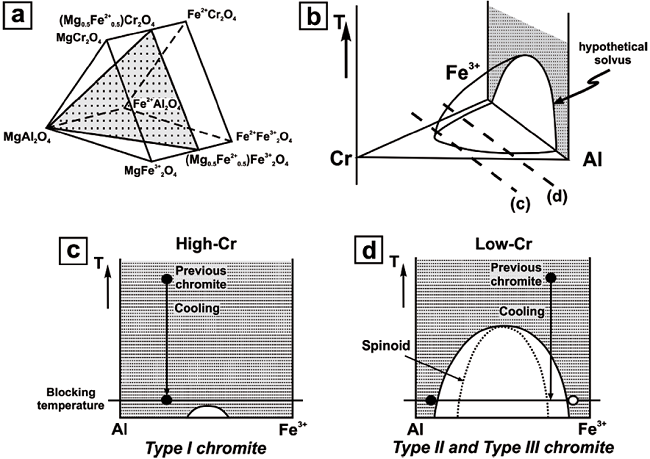 Coláset al. (2016) suggested that the variety of textures in Los Congos and Los Guanacos chromitites is mainly controlled by the Cr2O3 and Fe2O3 content in chromite (Table 1;Figure 4a to4f). Under the assumption that Type II and Type III chromites had a similar composition prior to exsolution, such a process could be represented on an ideal phase diagram of chromite (Figure 8). In this diagram, the composition in major elements of Type I chromite and spinel-rich and magnetite-rich phases in Type II and Type III chromites may be represented by an hypothetical solvus on the (Mg0.5Fe2+0.5)Cr2O4-MgAl2O4-(Mg0.5Fe2+0.5)Fe3+2O4 plane, included in the Cr-spinel prism (Figure 8a and8b) (Tamura and Arai, 2004). As shown inFigure 8b to8d, the extension of the solvus is more restricted in chromites with high Cr2O3, than in those with low Cr2O3. Therefore, Type I chromite with higher Cr2O3 but lower Fe2O3 contents (Cr# = 0.47-0.73 and Fe3+/(Fe2 ++Fe3+) = 0.24-0.54) than Type II and Type III chromites (Cr# = 0.54-0.59 and Fe3+/(Fe2++Fe3+) = 0.60-0.61) (Table 1;Figure 4a to4f), should be expected to plot out of the solvus at >600 ºC, which is the blocking temperature calculated by Coláset al. (2016) -i.e., the minimum possible temperature for exsolution (Figure 8b-c). However, Type II and Type III chromites prior to exsolution (i.e., 800 ºC, the metamorphic peak conditions estimated byEscayolaet al., 1996,2004) would be found in the miscibility gap during the cooling from granulite to amphibolite facies, as recorded in the host granulites (Escayolaet al., 1996,2004;Rapelaet al., 1998;Otamendiet al., 1999,2004,2005;Martinoet al., 2010).