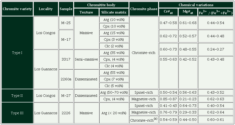 Type I chromite is found in clinopyroxene-bearing massive, semi-massive and disseminated samples from Los Congos and Los Guanacos massifs, whereas Type II chromite is preserved exclusively in clinopyroxene-bearing disseminated samples from Los Congos, and Type III chromite occurs in clinopyroxene-free massive chromitites from Los Guanacos (Table 1).