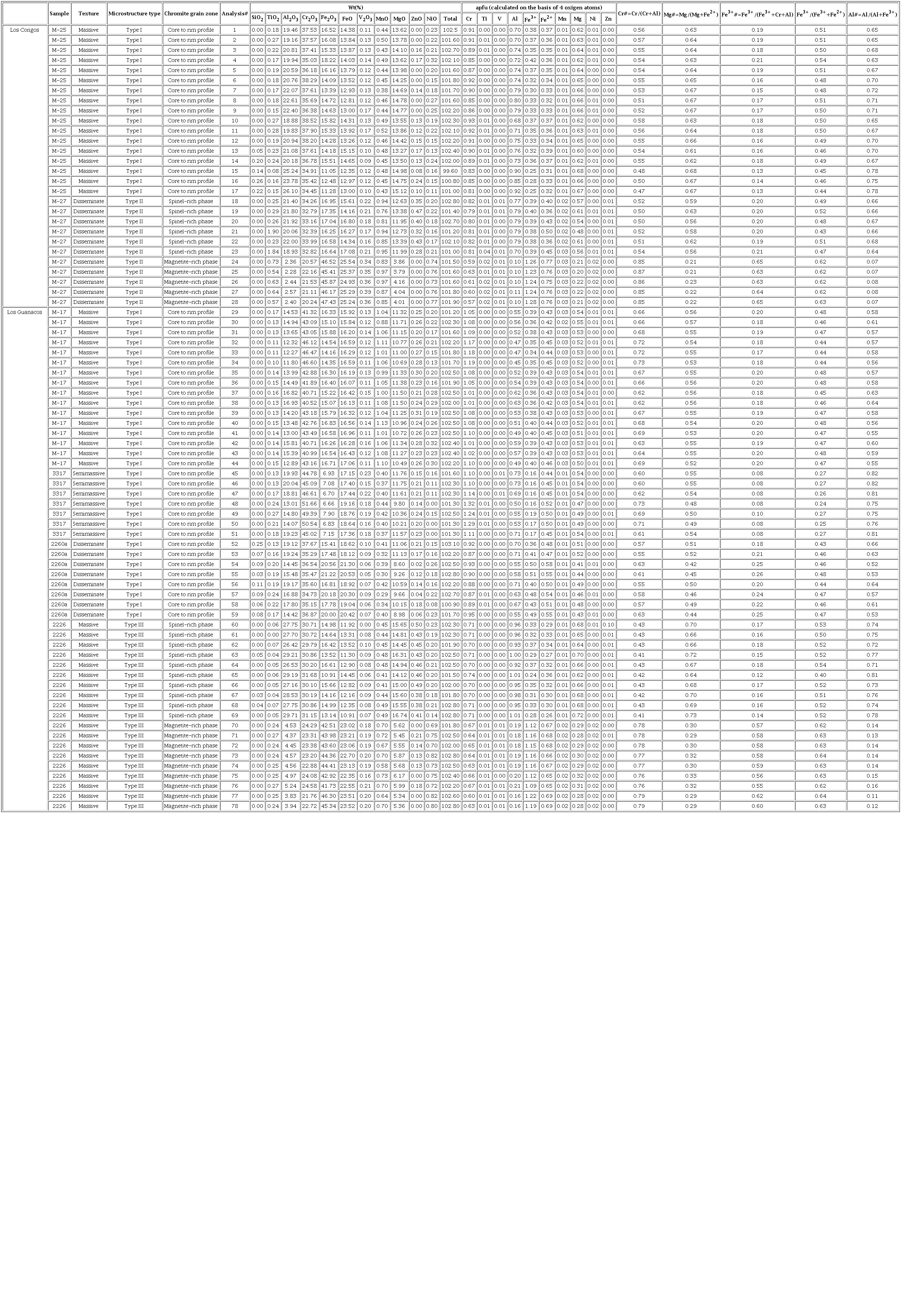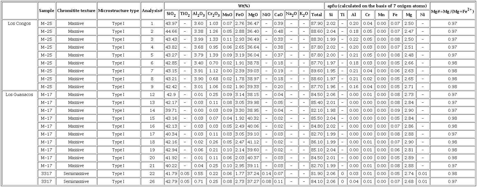 Antigorite is present in Type I, Type II and Type III chromites (Table 1), but its composition varies in the different ultramafic massifs. Antigorite crystals in the chromitite bodies from Los Congos (n= 9) vary within the following ranges: 42.42-44.66 wt.% SiO2, 36.04-39.33 wt.% MgO, 3.01-3.99 wt.% Al2O3, 1.48-3.19 wt.% FeO, and 0.68-1.39 wt.% Cr2O3. Antigorite from Los Guanacos (n= 12) has relatively higher MgO (37.24-41.12 wt.%) and FeO (1.77-3.30 wt.%), but relatively lower SiO2 (39.71-43.16 wt.%), Al2O3 (up to 0.71 wt.%), and Cr2O3 (0.03-0.26 wt.%) than those from Los Congos (Appendix 2).
