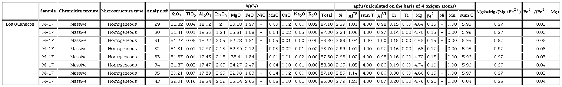 Chlorite (n= 8) associated with Type I chromite in chromitites from Los Guanacos (Table 1) have narrowly variable SiO2 (29.01-31.87 wt.%), Al2O3 (17.45-18.36 wt.%), MgO (32.78-34.27 wt.%), and FeO (1.83-2.63 wt.%) (Appendix 2). All the analysed grains contain significant amounts of Cr2O3 (1.94-3.95 wt.%), but their low Fe/(Fe+Mg) ratios (up to 0.04) overlap the compositional field of clinochlore defined byHey (1954) (Appendix 2).