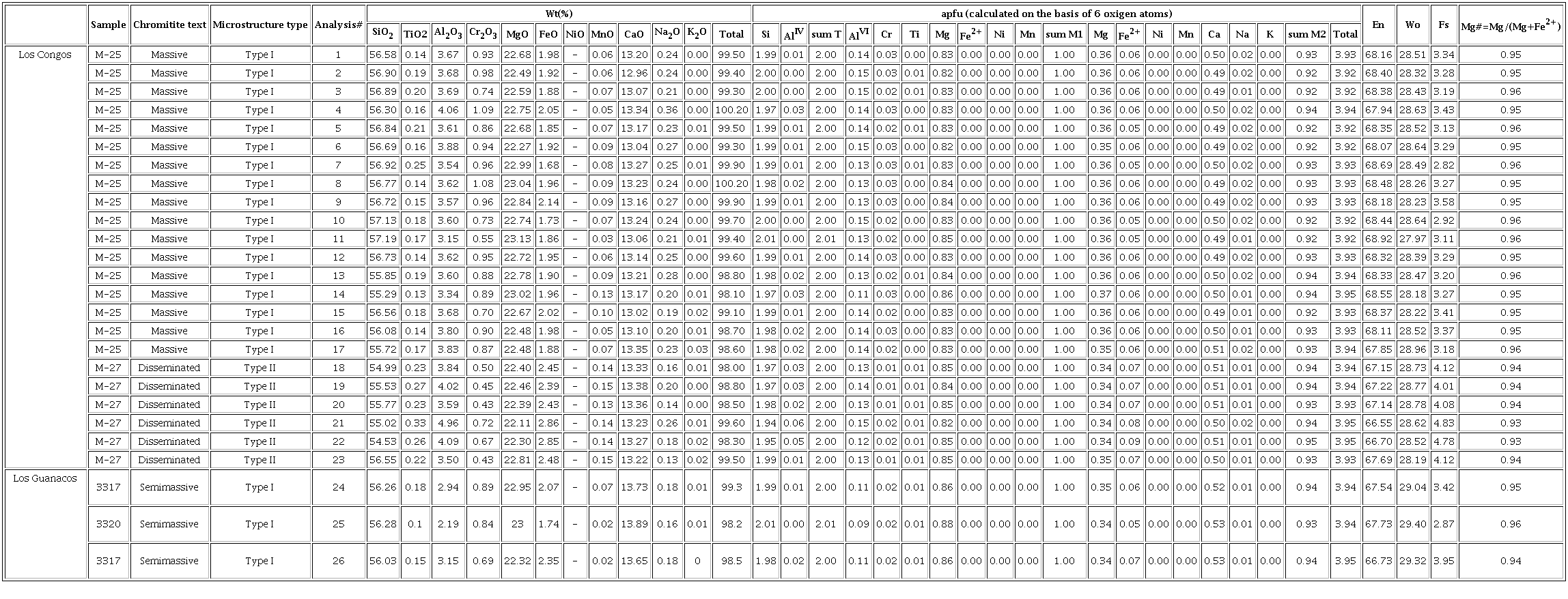 Clinopyroxene (n= 26) identified in Type I and Type II chromites (Table 1) has a Mg-rich augite composition (Wo28-29 En67-69 Fs3-5) (Appendix 2), but its composition varies in different types of chromite. Clinopyroxene grains which are associated with Type I chromite in chromitites from Los Congos and Los Guanacos (Table 1) show similar Mg# (0.94-0.96), SiO2 (55.29-57.19 wt.%), Al2O3 (2.19-4.06 wt.%) and CaO (12.96-13.89 wt.%), with relatively higher Na2O (0.16-0.36 wt.%) and Cr2O3 (0.55-1.09 wt.%), and lower TiO2 (0.10-0.25 wt.%) and MnO (0.02-0.13 wt.%) than those from Type II chromites in Los Congos (Mg# = 0.93-0.94, SiO2 = 54.53-56.55 wt.%, Al2O3 = 3.50-4.96 wt.%, CaO = 13.22-13.38 wt.%, Na2O = 0.13-0.26 wt.%, Cr2O3 = 0.43-0.72 wt.%, TiO2 = 0.22-0.33 wt.%, and MnO = 0.13-0.15 wt.%) (Appendix 2).