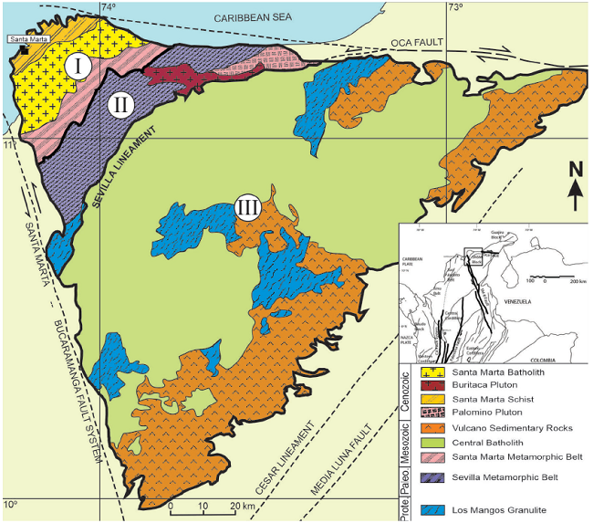 The Sevilla Metamorphic Belt controls the current configuration of the SNSM. It is constrained by the Sevilla Lineament, a first order structure whose features limit the surface of a subduction zone during the Upper Permian and Triassic (Piraquive, 2017; Cardona et al., 2010a, 2010b; Tschanz et al., 1969). Along this structure, mafic and anorthositic gneisses, schists and allochthonous blocks of granulites crop out, the latter making part of a Neoproterozoic arc that existed during Rodinia break-up and was later metamorphosed in Permian-Triassic times, possibly during the Laurentia-Gondwana collision (Piraquive, 2017). Different magmatic events are found to intrude the Sevilla lineament causing the formation of several parallel structures, among these, the Eocene Buritaca pluton, in contact with the Precambrian anorthosites and other Permian, Cretaceous and Paleogene magmatic bodies (Tschanz et al., 1969).