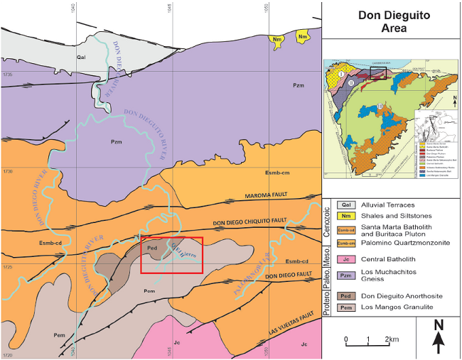The study area is located in El Hierro creek, a medium-sized tributary of the Don Dieguito river, at the northern slope of the SNSM, near the Don Diego river (Figure 2). In this location, Tschanz (1969) reported the occurrence of minor ilmenite-apatite mineralization related to the Precambrian Don Dieguito Anorthosites. The main units that outcrop along the studied area are: 1) Los Mangos granulite, 2) Don Dieguito Anorthosite, 3) Santa Marta batholith and the Buritaca pluton, covered by alluvial terraces.