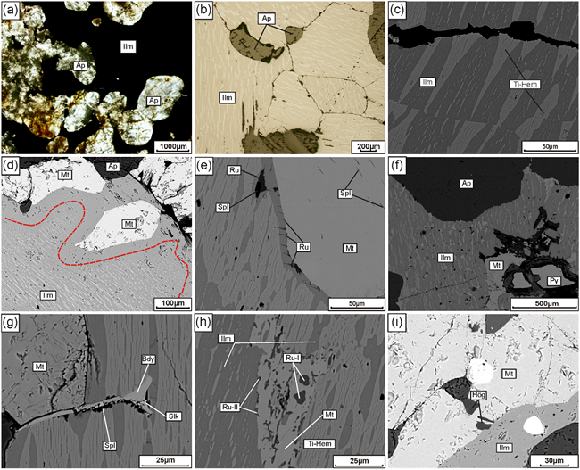 Furthermore, a symplectitic texture is observed between rutile and magnetite grains (Figure 5h), with two different grain size groups and their location in relation with magnetite, possibly indicating different rutile formation stages: rutile I is embedded in the magnetite while rutile II is present along its margins. Finally, it must be noted that small amounts of a Zn-bearing minerals are present as small grains in contact with magnetite and ilmenite, possibly belonging to the högbomite group (Figure 5i), with 1.7-11.8 wt.% ZnO and 5.06-6.75 wt.% TiO2 (7 analyses). Högbomite group minerals have been reported in other Fe-Ti oxide deposits (e.g., Devaraju et al., 1981; Mohanty et al., 2000).