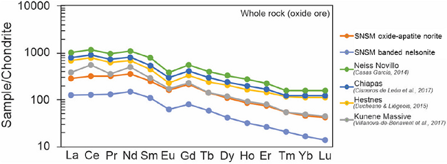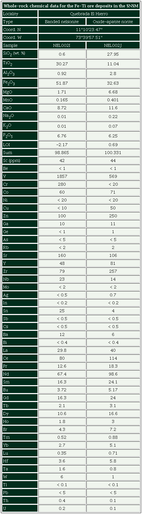 Both the oxide-apatite norite and the banded nelsonite REE patterns depict a negative slope (Figure 6, Table 1). Additionally, both show a negative Eu anomaly. A comparison between the REE data in the studied nelsonites and other Fe-Ti(-V) oxide mineralizations around the world is displayed in Figure 6. Similarities in the spider diagrams of nelsonites found in Chiapas (Cisneros de León et al., 2017), Hestnes (Duchesne and Liégeois, 2015) and Kunene (Villanova-de-Benavent et al., 2017) indicate that the origin of the SNSM nelsonites could be similar. The Nelsonites in the Hestnes deposit are cumulates in an immiscible Fe-rich, Si-poor melt in oxidizing conditions (Duchesne and Liégeois, 2015).