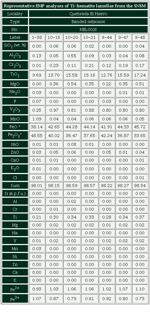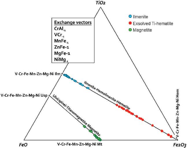 Finally, measured points within the titaniferous hematite lamellae exsolved from ilmenite give highly variable Ti (Table 3, Figure 7). TiO2 in the banded nelsonite varies from 2 to 18.1 wt %, but possible contamination from the ilmenite host cannot be discarded; and V ranges from 0.17 to 0.88 wt % V2O3.