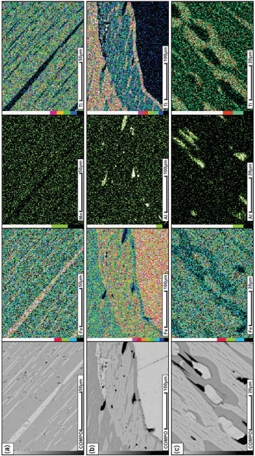 The chemical composition of ilmenite in the two mineralization types identified is very similar in terms of Ti and Fe (Figure 7, Table 2). In general, ilmenite from the SNSM has a TiO2 content ranging from 41.6 to 50.4 wt % (0.78-0.95 apfu Ti, 37 analyses) in the banded nelsonite, and from 49.2 to 50.1 wt % (0.93-0.94 apfu Ti, 3 analyses) in the oxide-apatite norite. No relation between the amount of Ti and the location of the measured point has been observed when measuring ilmenite points close or away from the lamellae. Note that, in the element maps of Figure 8, there is no significant compositional variation between the portion of ilmenite in contact with the lamellae and the parts away from them (Figure 8a). V content is low, ranging from 0.3 to 0.6 wt % V2O3 in the banded nelsonite, and of 0.4 wt % V2O3 in the oxide-apatite norite.